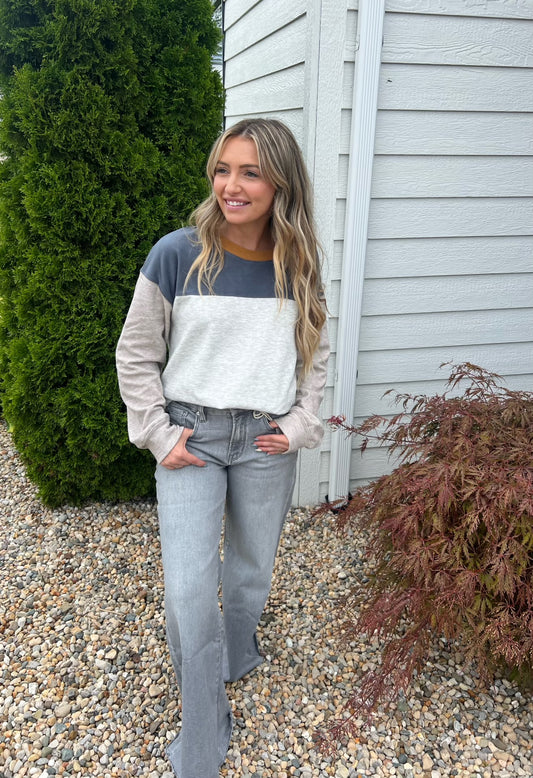 Slate Grey Crew Neck Color Block Fleece Pullover