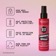Redken's Thermal Spray High Hold is a thermal setting mist that provides max, long-lasting hold and heat protection for up to 450 degrees while adding shine, offering anti-frizz control, and providing long-staying power. Formulated with cranberry seed oil and ceramides, Redken's Heat Restyling Technology features a unique formula that protects the hair cuticle from damage and allows you to change your style between washes by applying heat to reactivate the formula.